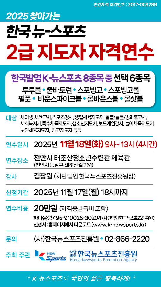 2025 찾아가는 한국뉴스포츠 2급 지도자 자격연수 안내(천안)