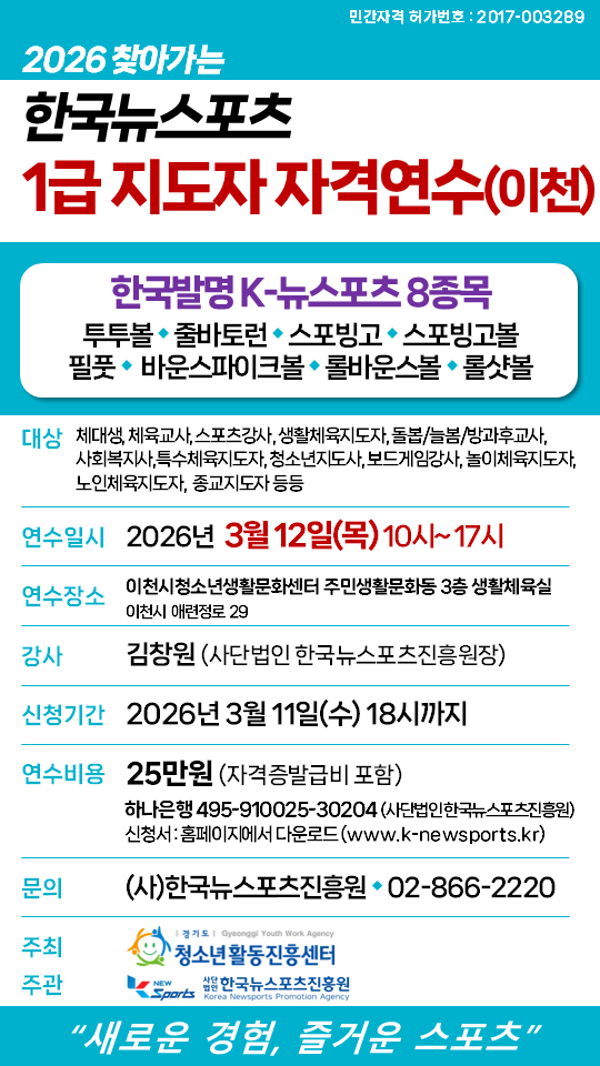 2026년 한국뉴스포츠지도자 1급 연수가 경기도 이천시에서 개최됩니다!