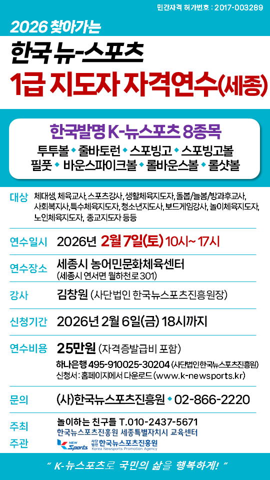 2026 찾아가는 한국뉴스포츠 1급 지도자 자격연수 안내(세종)
