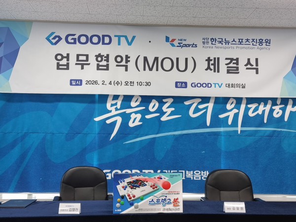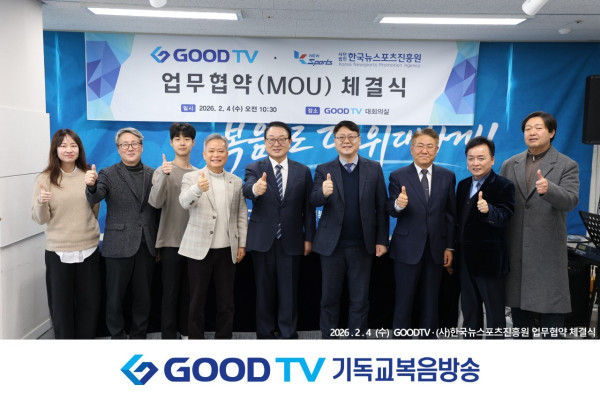 2026년 2월 4일(수), GOOD TV 기독교복음방송과 (사)한국뉴스포츠진흥원이 MOU 업무 협약을 체결했습니다 이번 자리는 K-뉴스포츠의 가치를 더 많은 분과 나누기 위한 의미 있는 출발점이 되었으며, K-뉴스포츠 선교와 전도 계획에 현장은 설렘과 기대감으로 가득 찼습니다. 그리고 올해 GOODTV배 전국기독교대안학교 스포빙고볼대회 또는 전국교회대항 스포빙고볼대회를 함께 추진하기로 했습니다.